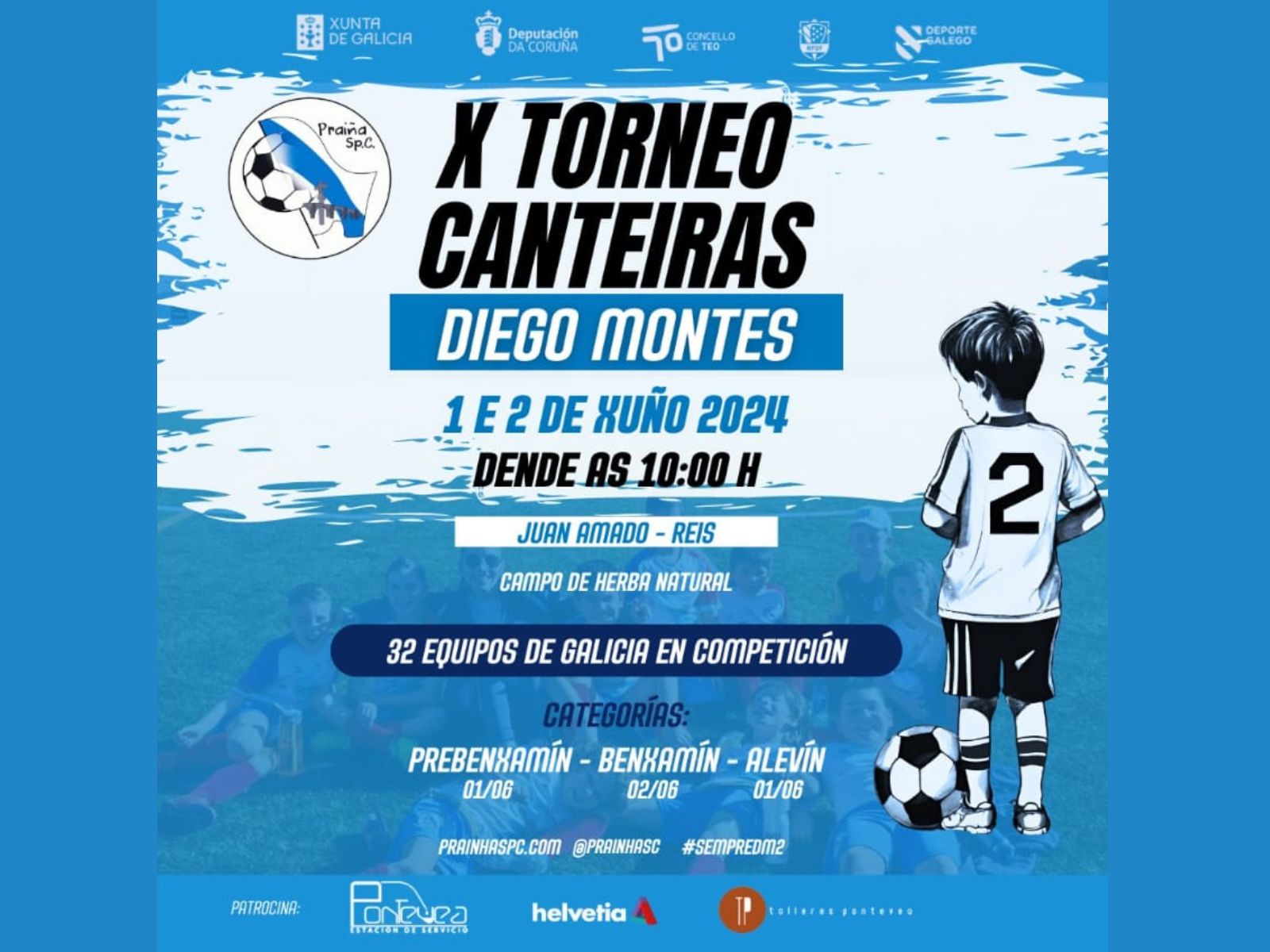 Así, el campo Juan Amado, en la parroquia de Reis (Teo), se convertirá los días 1 y 2 de junio en la gran cita de los canteras del fútbol gallego. Se medirán en las categorías de prebenjamín, benjamín y alevín un total de 32 equipos de 18 clubs, procedentes  de una docena de ayuntamientos gallegos. El listado de participantes incluye a la S.R. San Xoán de Calo y S.D. Cacheiras (Teo); Club Atlético Fátima, S.D. Villestro y Club deportivo Conxo (Santiago); Escolas deportivas de Vedra;  S.D. Touro; Milladoiro S.D. (Ames); S.D. Esclavitud (Padrón); S.D. Urdilde (Rois); Escola deportiva Xuventude Oroso; S.D. Cruces: Escola de fútbol Silleda, Escola Estrada de Fútbol base y S.D. Bandeira (Silleda); Escola de fútbol Lalín; y la Escola de fútbol Concello de Boiro.